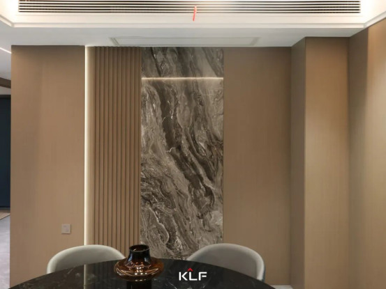 冷冽的巖板從溫潤的木作墻板中鋪展而下,似冰川碎玉墜入溫厚的土壤,碰撞激蕩出豐富的視覺張力。如星河漫流般的深邃紋路,為空間注入靜默的高級感——不張揚,卻充滿力量。