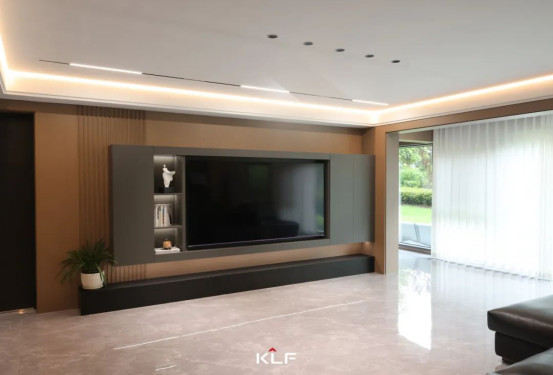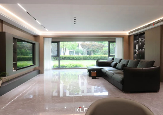 客廳全景落地窗將天光引入,在開闊的共享空間里,燈帶與射燈默契交織,以柔和的光暈漫射,勾勒出溫暖而不失層次的光影敘事。