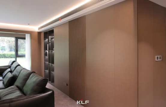 滿墻護墻板中氣韻生動的木紋流淌著雋永詩意,平板造型與立體格柵錯落疊構(gòu),以黃金比例展開剛?cè)嵯酀牟馁|(zhì)對話。