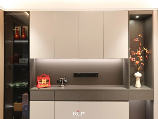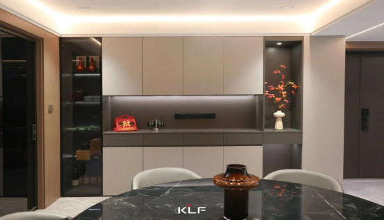 通頂餐邊柜以穿插手法構(gòu)筑雅致端景,與暗藏燈帶共同編織出光影詩行。柜體采用虛實相生的設計哲學,通透中透著靈動的玻璃柜門內(nèi),展呈珍藏的餐具與美酒,溫潤的木質(zhì)柜體則悄然收納生活瑣碎。在此處,收納亦成為一場精妙的陳列藝術。