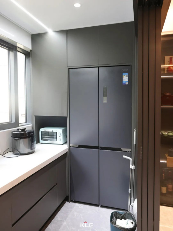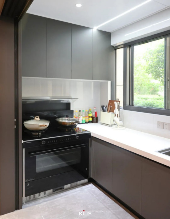 櫥柜設計摒棄繁雜,莫蘭迪青砂色啞光質(zhì)感如天鵝絨般鋪陳于吊柜柜門,與深灰色地柜構(gòu)成蒙德里安式的幾何對話。嵌入式廚電與升降拉籃組成的垂直收納系統(tǒng),讓爆炒江湖亦不失從容氣度。