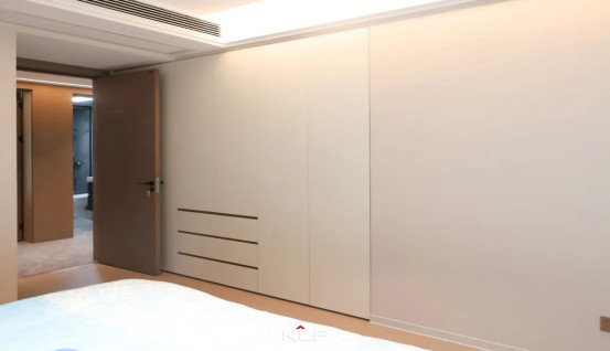 循著整體的設計脈絡,主臥以舒展的尺度承載從容的生活節(jié)奏,勾勒出同樣優(yōu)雅的生活圖景。茶白主色調(diào)如晨曦薄霧般輕盈純凈,為睡眠注入靜謐的能量場。
