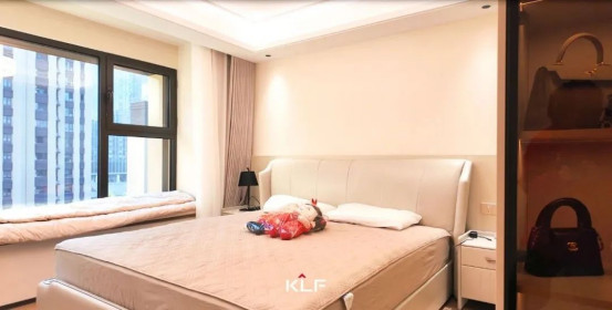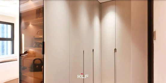 臥室以L形的轉(zhuǎn)角柜做收納和隔斷,合理劃分生活區(qū)域,一半是睡眠的床鋪區(qū)域,一半是步入式衣帽間,提升居住體驗。玻璃柜門以展示型收納美學(xué)為核心,融合功能與藝術(shù)的雙重屬性,成為高品位生活的具象化表達。
